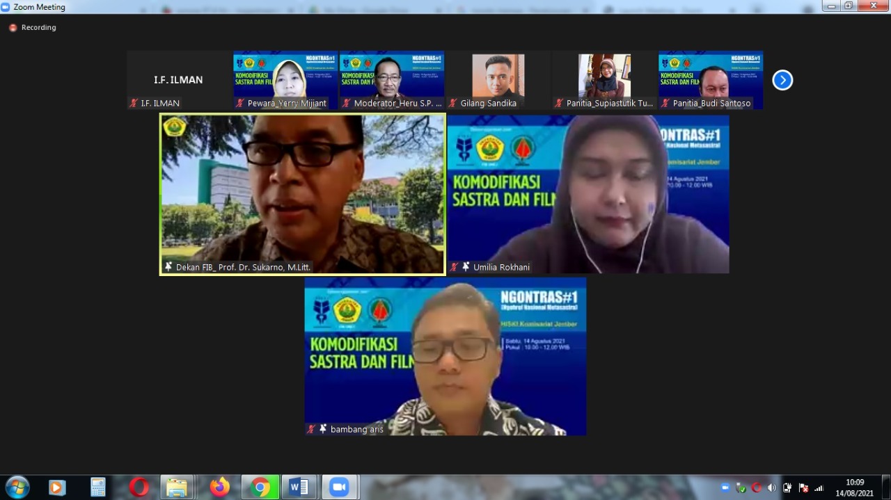Pendapat ini dilontarkan dosen Fakultas Ilmu Budaya Universitas Jember, Bambang Aris Kartika saat menjadi pemateri dalam kegiatan webinar NGONTRAS#1 (Ngobrol Nasional Metasastra) bertema “Komodifikasi Sastra dan Film” yang digelar oleh Himpunan Sarjana Kesusastraan Indonesia (HISKI) Komisariat Jember (14/8).
