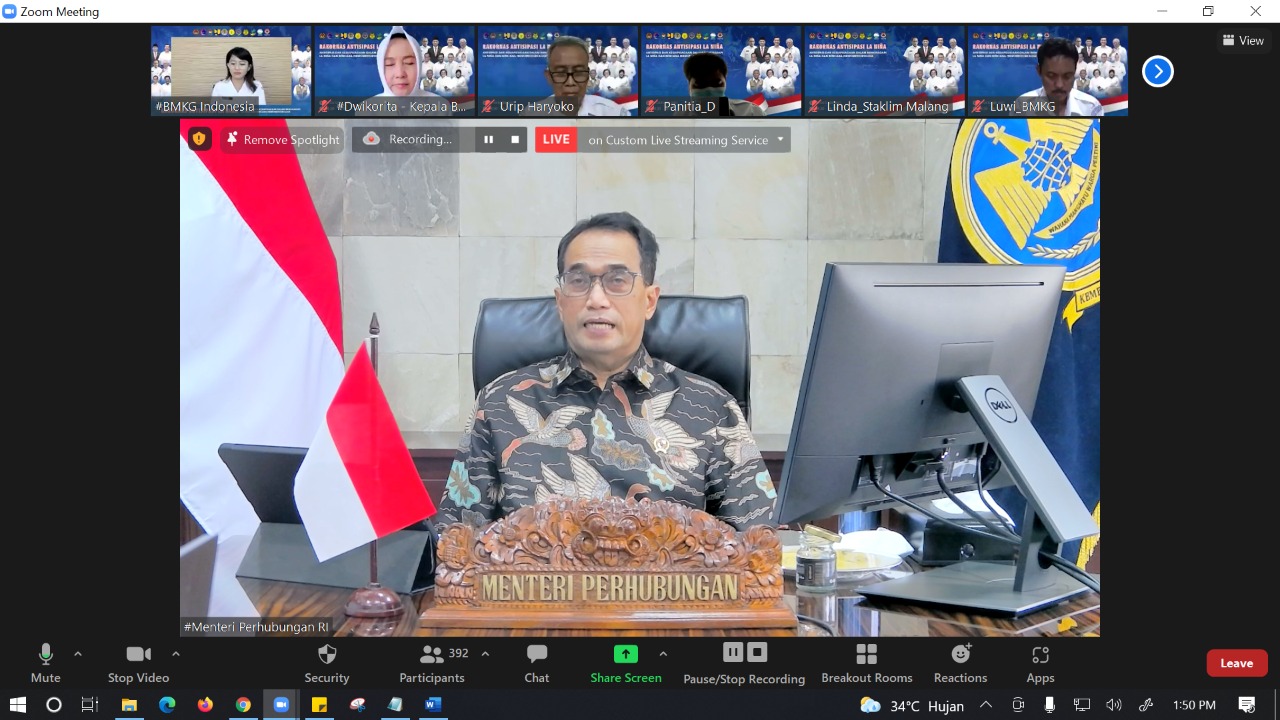 Jakarta – Kementerian Perhubungan telah menyiapkan sejumlah langkah antisipasi menghadapi fenomena La Nina yang menurut Badan Meteorologi, Klimatologi, dan Geofisika (BMKG) diprediksi terjadi pada akhir tahun 2021 dan awal tahun 2022, karena curah hujan yang tinggi. Demikian disampaikan Menteri Perhubungan Budi Karya Sumadi saat menjadi pembicara kunci pada Rapat Koordinasi Nasional (Rakornas) BMKG Tahun 2021 bertema “Antisipasi & Kesiapsiagaan dalam Menghadapi La Nina & Bencana Hidrometeorologi” secara daring pada Jumat (29/10).