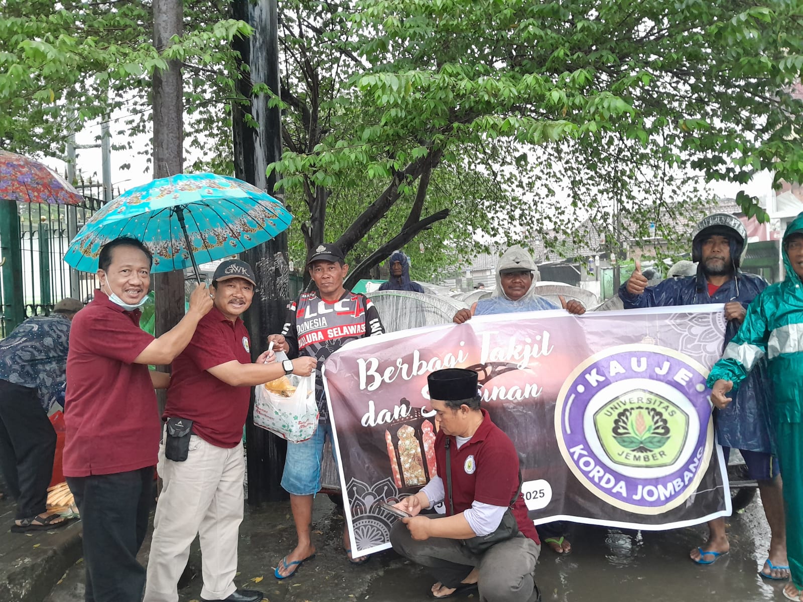 Di titik kedua di depan Stasiun Jombang. Di sini telah menunggu puluhan abang becak yang telah antre. Diiringi guyuran hujan tak menyurutkan langkah pengurus KAUJE Korda Jombang berbagi kepada masyarakat yang sedang berpuasa.