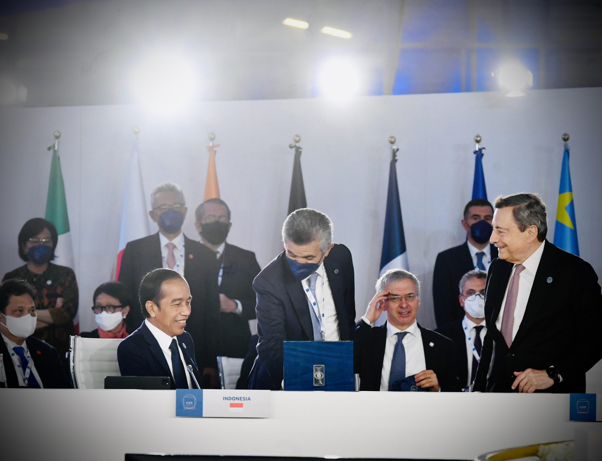 “Saya sampaikan selamat kepada Italia yang telah sukses menjalankan presidensi G20 di tahun 2021. Indonesia merasa terhormat untuk meneruskan presidensi G20 di tahun 2022,” ujar Presiden Jokowi.
