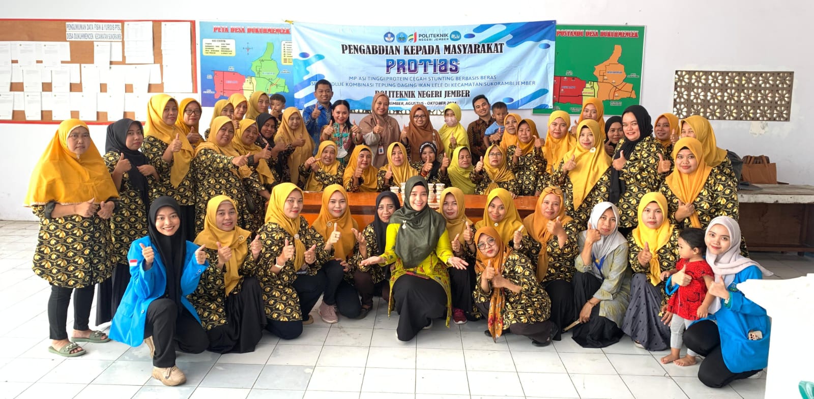 Politeknik Negeri Jember adakan pelatihan pembuatan produk inovasi Protias MP-ASI (Makanan Pendamping ASI) tinggi protein cegah stunting berbasis tepung beras sehat kombinasi tepung daging ikan lele di puskemas Sukorambi. Rabu,( 2/10).