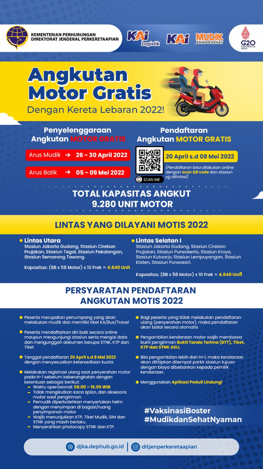 “Ini merupakan kali kedua KAI Logistik kembali ditugaskan sebagai ekspedisi/pelaksana kegiatan angkutan motor gratis. Kami sangat senang dapat terlibat dan menjadi bagian dari serangkaian kegiatan mudik dimana ini merupakan mudik pertama di masa pandemi. Kami telah memastikan kesiapan pendukung operasional baik sarana, SDM hingga sistem untuk angkutan Motis 2022 dan siap mengangkut 9.280 motor untuk arus mudik dan balik sesuai dengan kuota yang disediakan oleh Pemerintah,” tutup pria yang akrab disapa Malik.
