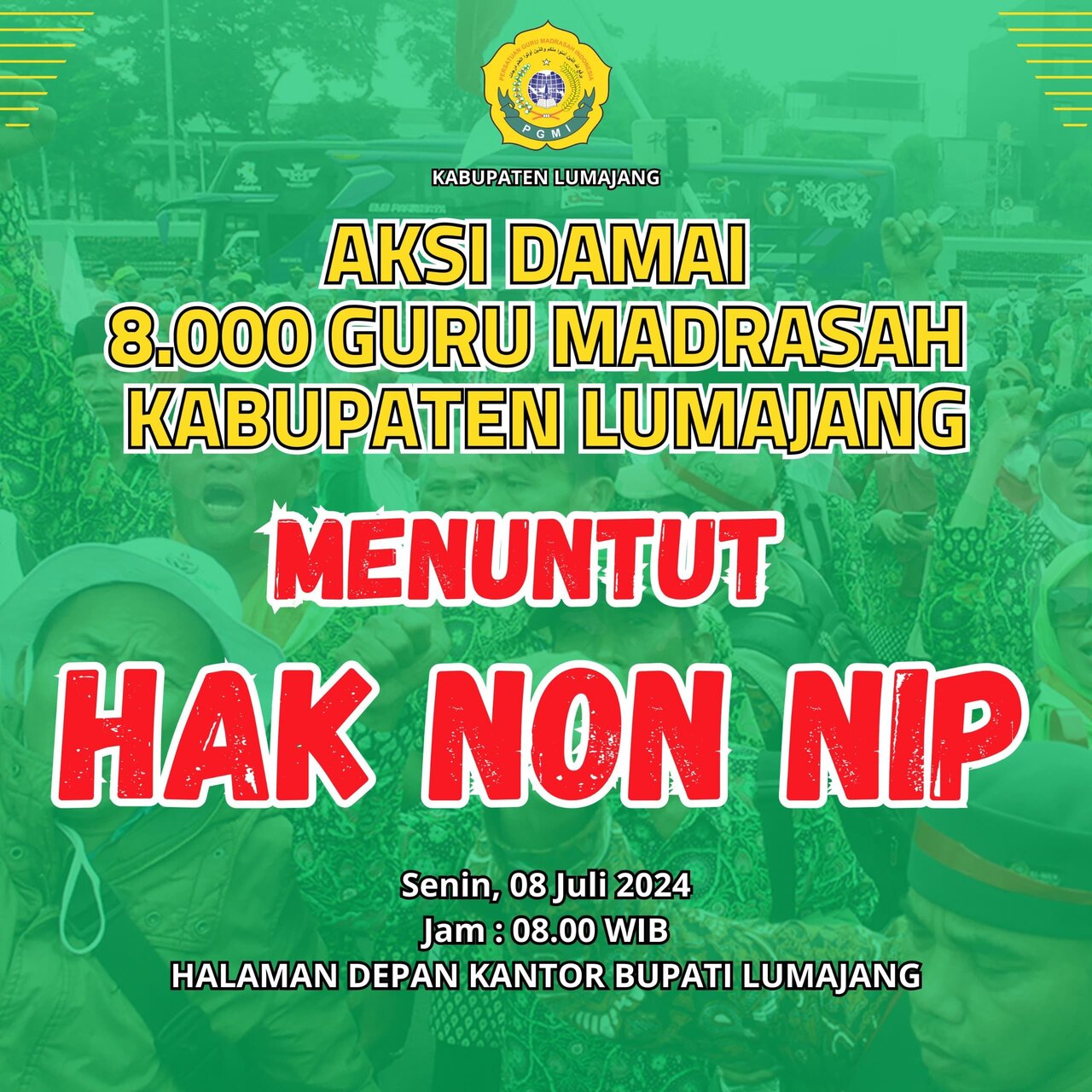 Sejumlah 8 ribu guru NON NIP mulai dari guru TK, RA, PAUD, SD, MI, dan MTs swasta di Lumajang akan gelar demonstrasi di Pemkab Lumajang, Senin 08 Juli 2024. Para guru akan menemui Penjabat (PJ) Bupati dan Sekda Lumajang untuk menanyakan kejelasan tunjangan guru honorer (Guru NON NIP) yang tiba-tiba dihapus per Juli 2024, Minggu (7/7).