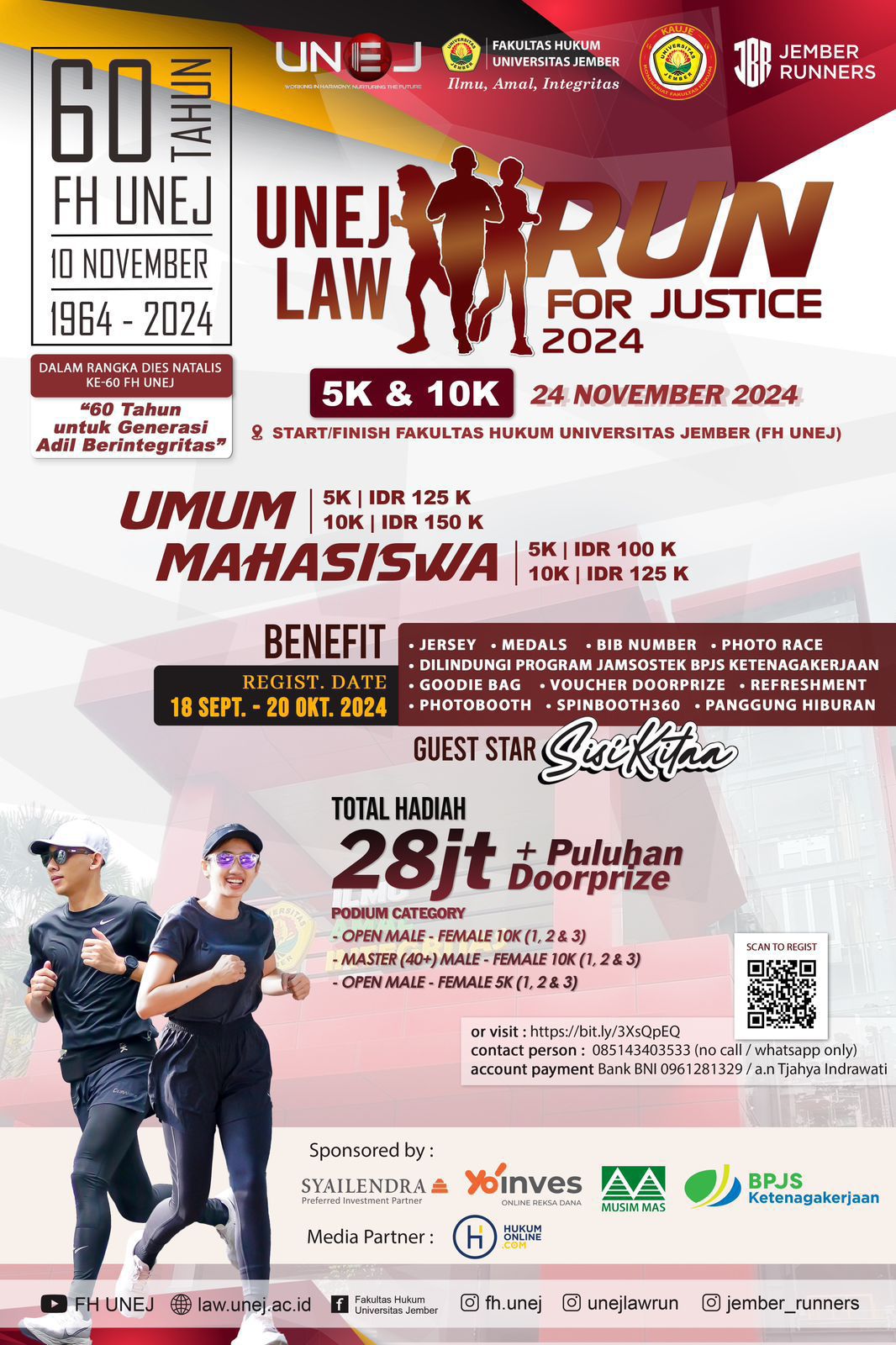 Dalam rangka memperingati Dies Natalis ke-60, Fakultas Hukum Universitas Jember (FH UNEJ) menyelenggarakan sebuah event olahraga bertajuk *”UNEJ LAW RUN FOR JUSTICE 2024″*. Kegiatan lari ini akan dilaksanakan pada Minggu, 24 November 2024, dengan titik start dan finish di Kampus FH UNEJ. Acara ini terbuka untuk seluruh keluarga besar FH UNEJ—dosen, tenaga kependidikan, mahasiswa, alumni—serta masyarakat umum.