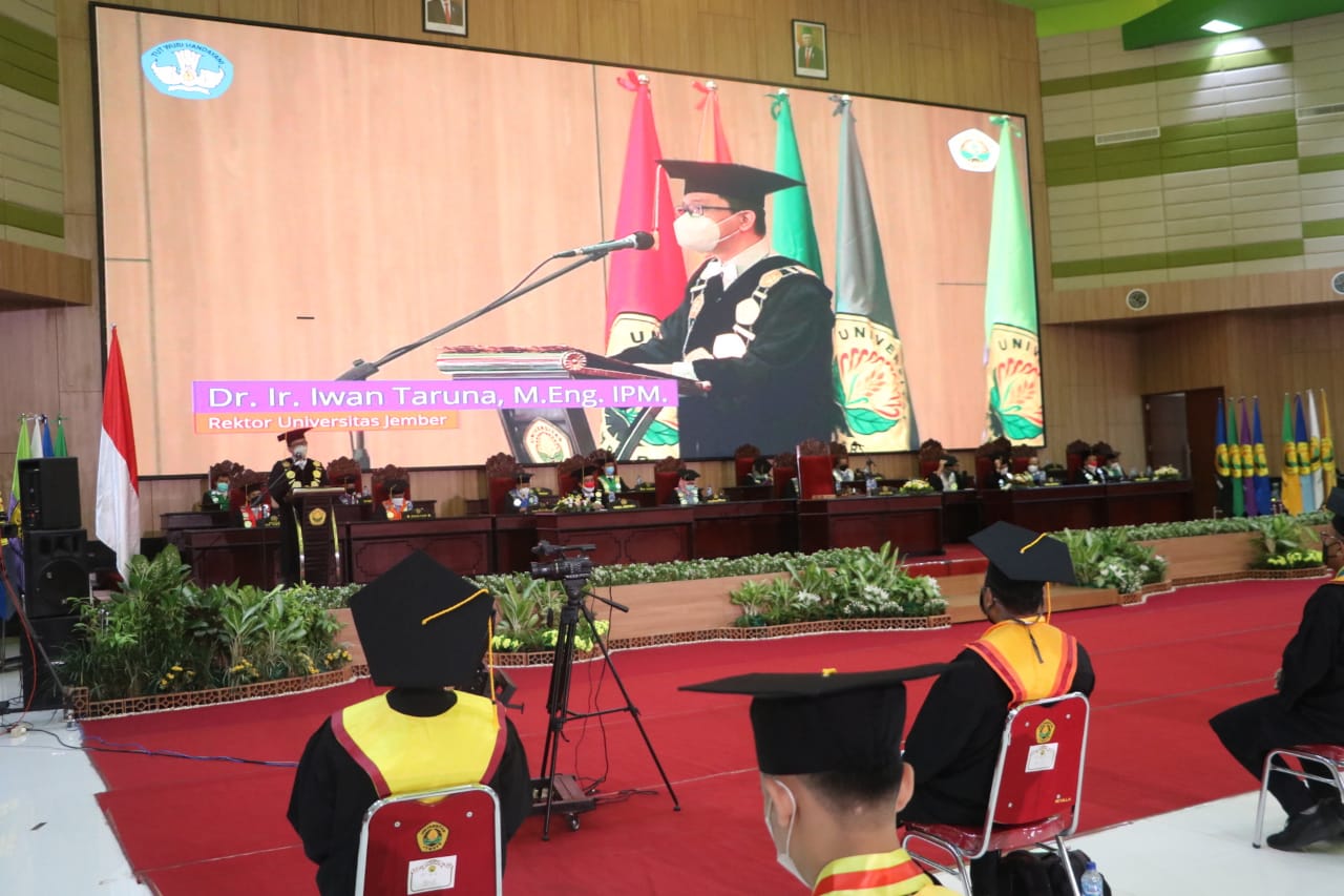 “Sebagai Perguruan Tinggi Negeri, Universitas Jember memiliki mahasiswa yang berasal dari berbagai daerah di Indonesia, begitu pula lulusan yang diwisuda hari ini. Oleh karena itu wisuda hibrid masih menjadi pilihan untuk menjamin kesehatan semua pihak. Untuk itu saya mengajak segenap keluarga besar Universitas Jember untuk terus mentaati protokol kesehatan sesuai anjuran pemerintah,” kata Iwan Taruna membuka pidato wisudanya.