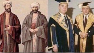 Tradisi tersebut bermula dari Universitas Al-Qarawiyyin, juga dikenal sebagai Universitas Al Quaraouiyine atau Al-Karaouine, adalah salah satu universitas tertua yang masih beroperasi hingga saat ini. Universitas ini terletak di kota Fes, Maroko, dan memiliki sejarah yang kaya dalam pengembangan pendidikan dan pengetahuan di dunia Islam. Universitas Al-Qarawiyyin adalah universitas pertama di dunia yang didirikan pada tahun 859. Sebagai salah satu universitas tertua di dunia, Universitas Al-Qarawiyyin memiliki tradisi dan prosedur yang unik dalam acara wisuda mereka. Acara wisuda di Universitas Al-Qarawiyyin diadakan secara tahunan untuk memperingati para mahasiswa yang telah menyelesaikan studi mereka dan meraih gelar akademik. Para mahasiswa dari Eropa yang telah lulus dari universitas tersebut ketika mereka Kembali ke negara asal biasanya mengenakan thawb atau jubah. Hal tersebut menandakan mahasiswa tersebut mereka merupakan lulusan dari Universitas Al-Qarawiyyin. Jack Goody dalam bukunya yang berjudul “Islam in Europe” menyebutkan bahwa Busana Arab (Thawb) merupakan tanda yang paling murni dan paling jelas dari integritas akademik sampai hari ini, khususnya pada penyelenggaraan acara-acara akademik, seperti debat tentang tesis dan upacara kelulusan. Seiring perkembangan jaman, Sub-fusc (jubah) telah menjadi pakaian dalam perayaan wisuda. Inilah mengapa ketika kita lulus dari universitas hari ini, kita memakai gaun yang dikenal sebagai subfusc yang sangat mirip dengan thawb. Tradisi lainnya adalah penggunaan toga. Tradisi penggunaan toga juga berasal dari Universitas Al-Qarawiyyin. Seorang yang telah dianggap lulus dari universitas tersebut akan diberikan surban. Para ulama di sana meletakkan Al-Qur’an di atas surban untuk melambangkan keutamaan Kitab Suci di atas akal.