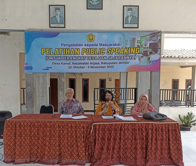Tim pengabdian masyarakat Fakultas Ilmu Budaya (FIB) Universitas Jember adakan pelatihan public speaking untuk perangkat desa dan jajarannya di balai desa Kamal, Arjasa, jember. Sabtu (22/10).